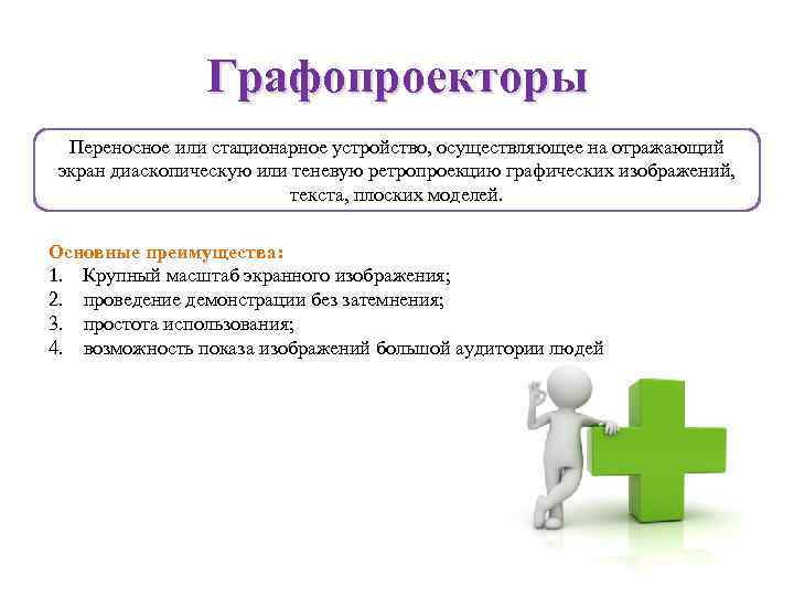 Графопроекторы Переносное или стационарное устройство, осуществляющее на отражающий экран диаскопическую или теневую ретропроекцию графических изображений, текста, плоских моделей. Основные преимущества: 1. Крупный масштаб экранного изображения; 2. проведение демонстрации без затемнения; 3. простота использования; 4. возможность показа изображений большой аудитории людей