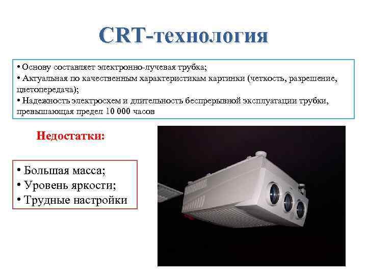 CRT-технология • Основу составляет электронно-лучевая трубка; • Актуальная по качественным характеристикам картинки (четкость, разрешение, цветопередача); • Надежность электросхем и длительность беспрерывной эксплуатации трубки, превышающая предел 10 000 часов Недостатки: • Большая масса; • Уровень яркости; • Трудные настройки
