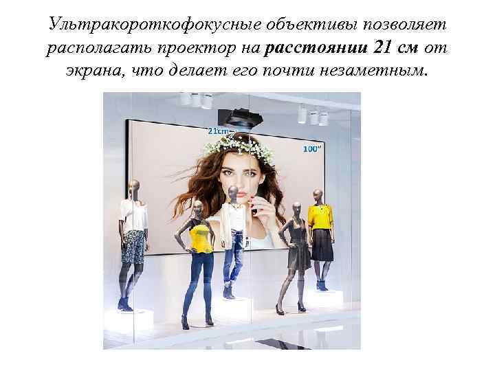 Ультракороткофокусные объективы позволяет располагать проектор на расстоянии 21 см от экрана, что делает его почти незаметным.