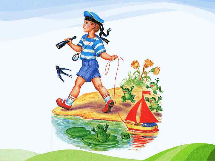 Кораблик Матросская шапка, Верёвка в руке. Тяну я кораблик по быстрой реке, И скачут лягушки за мной по пятам, И просят меня: - Прокати, капитан!