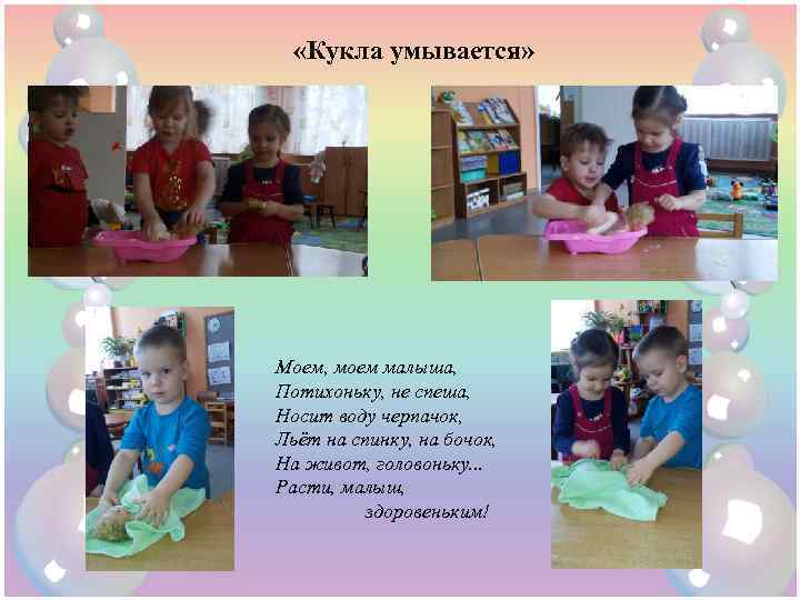 «Кукла умывается» Моем, моем малыша, Потихоньку, не спеша, Носит воду черпачок, Льёт на спинку, на бочок, На живот, головоньку. . . Расти, малыш, здоровеньким!