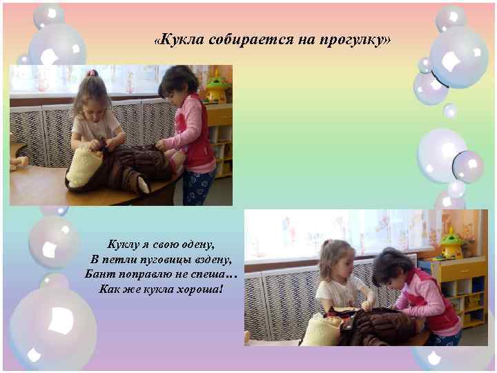 «Кукла собирается на прогулку» Куклу я свою одену, В петли пуговицы вздену, Бант поправлю не спеша… Как же кукла хороша!