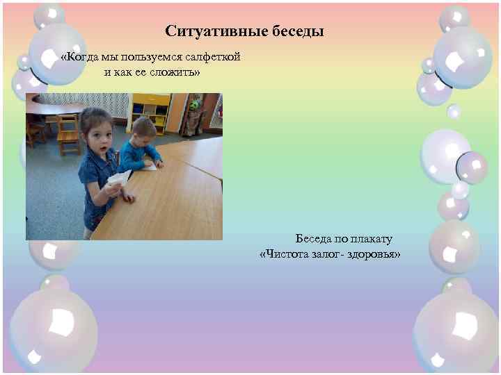 Ситуативные беседы «Когда мы пользуемся салфеткой и как ее сложить» Беседа по плакату «Чистота залог- здоровья»