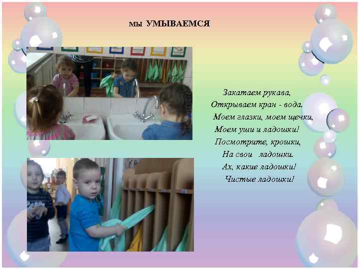 МЫ УМЫВАЕМСЯ Закатаем рукава, Открываем кран - вода. Моем глазки, моем щечки, Моем уши и ладошки! Посмотрите, крошки, На свои ладошки. Ах, какие ладошки! Чистые ладошки!