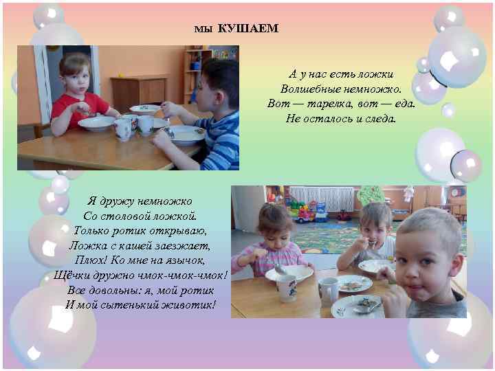 МЫ КУШАЕМ А у нас есть ложки Волшебные немножко. Вот — тарелка, вот — еда. Не осталось и следа. Я дружу немножко Со столовой ложкой. Только ротик открываю, Ложка с кашей заезжает, Плюх! Ко мне на язычок, Щёчки дружно чмок-чмок! Все довольны: я, мой ротик И мой сытенький животик!