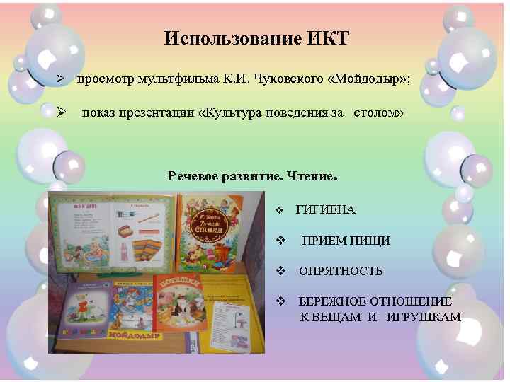 Использование ИКТ Ø просмотр мультфильма К. И. Чуковского «Мойдодыр» ; Ø показ презентации «Культура поведения за столом» Речевое развитие. Чтение. v v ГИГИЕНА ПРИЕМ ПИЩИ v ОПРЯТНОСТЬ v БЕРЕЖНОЕ ОТНОШЕНИЕ К ВЕЩАМ И ИГРУШКАМ