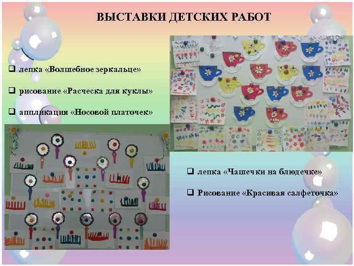 ВЫСТАВКИ ДЕТСКИХ РАБОТ q лепка «Волшебное зеркальце» q рисование «Расческа для куклы» q аппликация «Носовой платочек» q лепка «Чашечки на блюдечке» q Рисование «Красивая салфеточка»