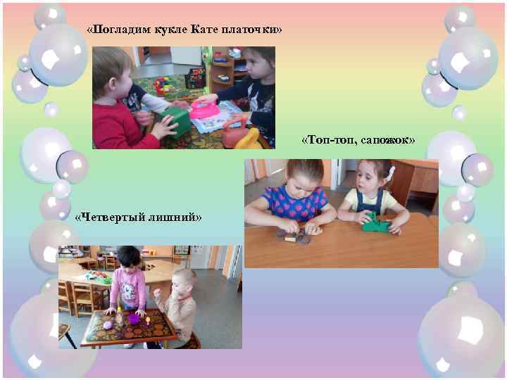 «Погладим кукле Кате платочки» «Топ-топ, сапожок» «Четвертый лишний»