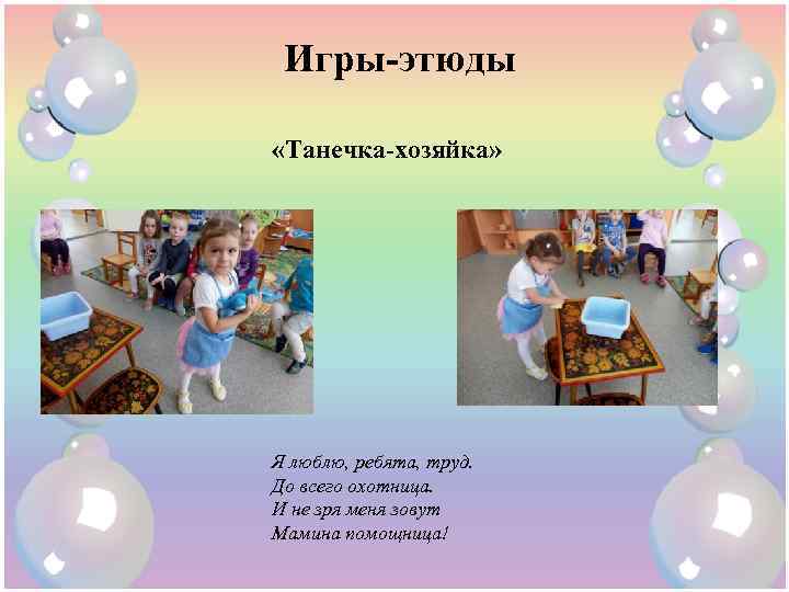 Игры-этюды «Танечка-хозяйка» Я люблю, ребята, труд. До всего охотница. И не зря меня зовут Мамина помощница!