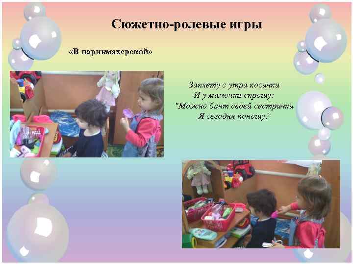 Сюжетно-ролевые игры «В парикмахерской» Заплету с утра косички И у мамочки спрошу: "Можно бант своей сестрички Я сегодня поношу?