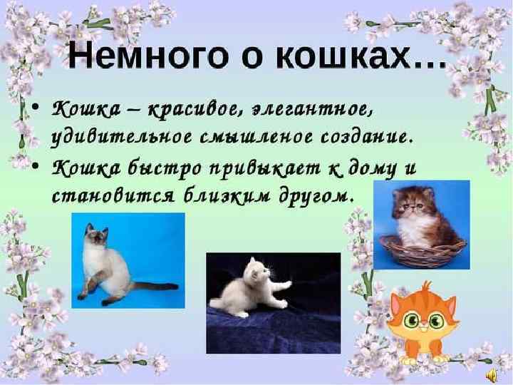 Этот зверь живёт лишь дома. С этим зверем все знакомы. У него усы, как спицы. Он мурлыча песнь поёт, Только мышь его боится… Угадали? Это … кот