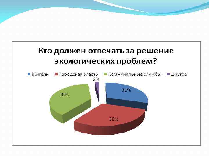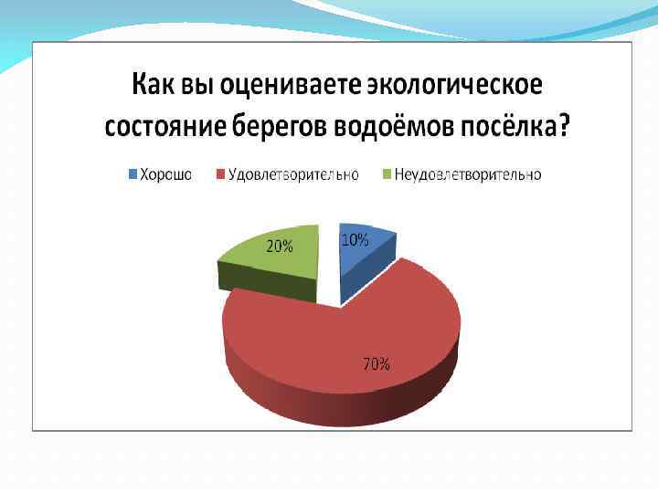 Основной этап № 2 Опрос учащихся школы и взрослого населения посёлка был проведён по следующим вопросам: 1. Как вы оцениваете экологическое состояние берегов водоёмов посёлка? Хорошо Удовлетворительно Неудовлетворительно 2. Кто должен отвечать за решение экологических проблем? Жители Городская власть Коммунальные службы Другое(Приложение № 10)