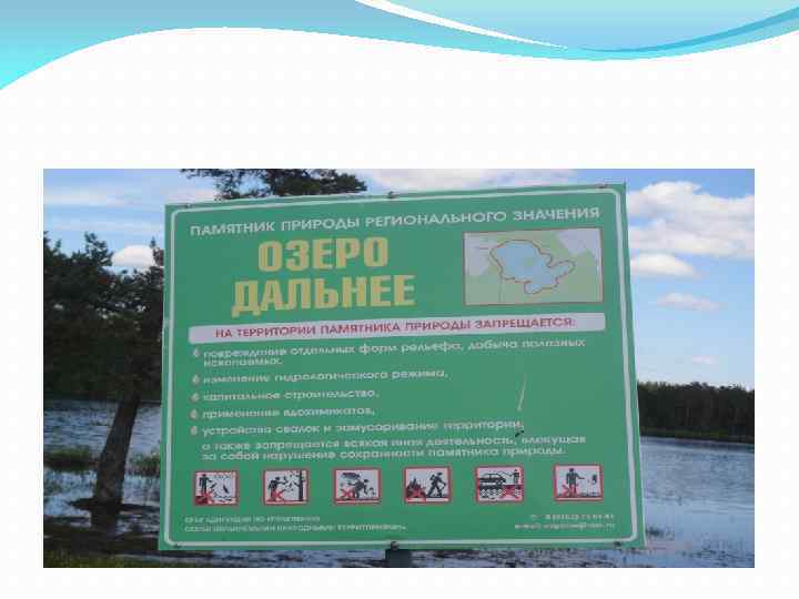 Подготовительный этап Площадь земельных участков, включенных в границы ООПТ без изъятия из хозяйственного использования: 166, 0 га Обоснование создания ООПТ и ее значимость: Данный памятник природы создается в целях сохранения карстового, периодически исчезающего озера Дальнее. Под четвертичными отложениями малой мощности здесь залегают карстующиеся известняки C 1 Sr. В одну из карстовых воронок, образовавшихся в этих известняках, и уходят периодически воды озера (раз в 5 - 9 лет). Глубина воронки - до 10 м. , сужается ступенеобразно. Посреди озера имеется низкий островок диаметром около 50 м. Сухой берег на южной стороне является местом отдыха жителей Угловки. Перечень основных объектов охраны: Озеро, берега в пределах охранной зоны Географическое положение: Западные отроги Валдайской возвышенности, восточная окраина Главного девонского поля вблизи подножия Карбонового уступа. Описание границ: По границе водоохранной зоны.
