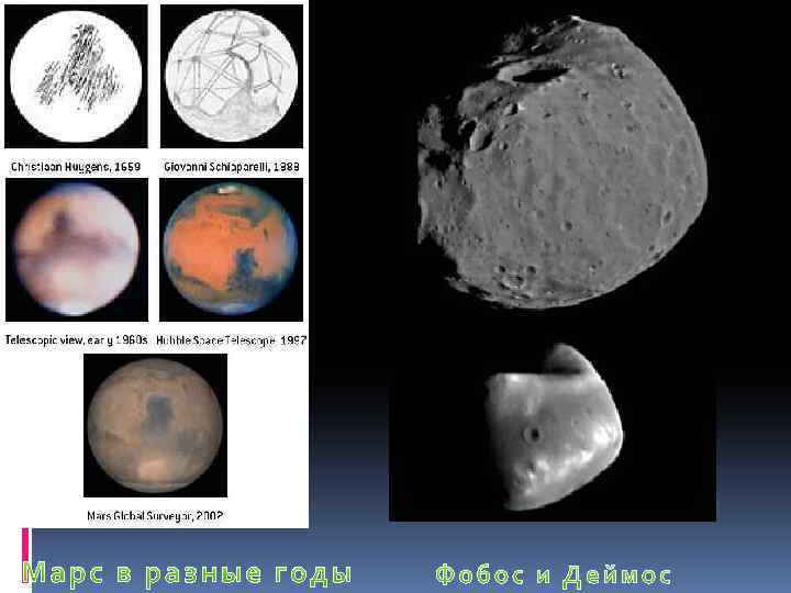 Спутники Марса § Естественными спутниками Марса являются § Фобос и Деймос. Оба они открыты американским астрономом Асафом Холлом в 1877 году. Фобос и Деймос имеют неправильную форму и очень маленькие размеры. По одной из гипотез, они могут представлять собой захваченные гравитационным полем Марса астероиды наподобие (5261) Эврика из Троянской группы астероидов. Спутники названы в честь персонажей, сопровождающих бога Ареса (то есть Марса), — Фобоса и Деймоса, олицетворяющих страх и ужас, которые помогали богу войны в битвах. Оба спутника вращаются вокруг своих осей с тем же периодом, что и вокруг Марса, поэтому всегда повёрнуты к планете одной и той же стороной. Приливное воздействие Марса постепенно замедляет движение Фобоса, и в конце концов приведёт к падению спутника на Марс (при сохранении текущей тенденции), или к его распаду. Напротив, Деймос удаляется от Марса.