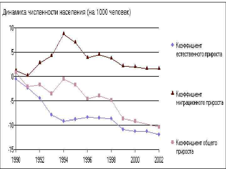 • С 1992 года началось стабильное сокращение численности населения из-за превышения уровня смертности над уровнем рождаемости (естественная убыль населения). В течение последних 15 лет в России ежегодно умирали более 2 млн. человек, что в расчете на 1000 человек в 2 раза больше, чем в европейских странах и США, в 1, 5 раза больше, чем в среднем в мире, а ежегодно рождались в этот период 1, 2 — 1, 5 млн. человек.