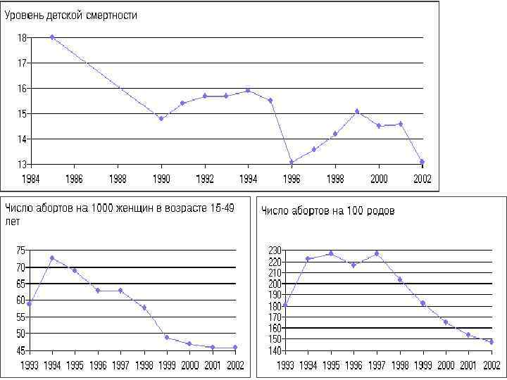 • На рождаемость отрицательно влияют: низкий денежный доход многих семей, отсутствие нормальных жилищных условий, современная структура семьи (ориентация на малодетность, увеличение числа неполных семей), тяжелый физический труд значительной части работающих женщин (около 15 процентов), условия труда, не отвечающие санитарно-гигиеническим нормам, низкий уровень репродуктивного здоровья, высокое число прерываний беременности (абортов).
