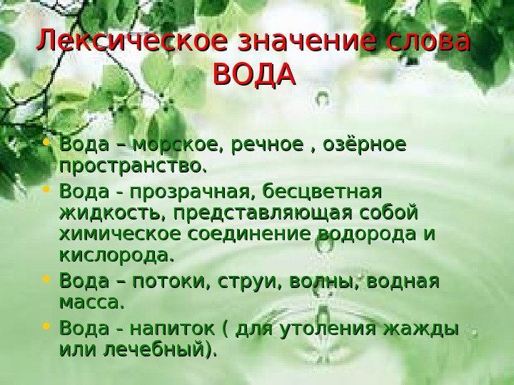 Лексическое значение слова ВОДА • Вода – морское, речное , озёрное пространство. • Вода — прозрачная, бесцветная жидкость, представляющая собой химическое соединение водорода и кислорода. • Вода – потоки, струи, волны, водная масса. • Вода — напиток ( для утоления жажды или лечебный).
