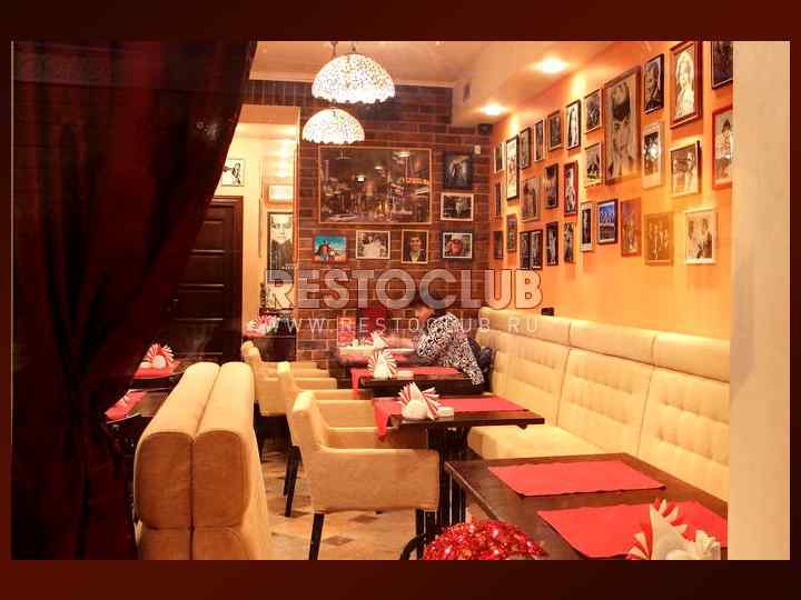 На большом экране телевизора тематическое сопровождение - старые голливудские фильмы, стены украшают портреты знаменитостей, среди которых каждый наверняка найдет любимого актера, режиссера или музыкального исполнителя.