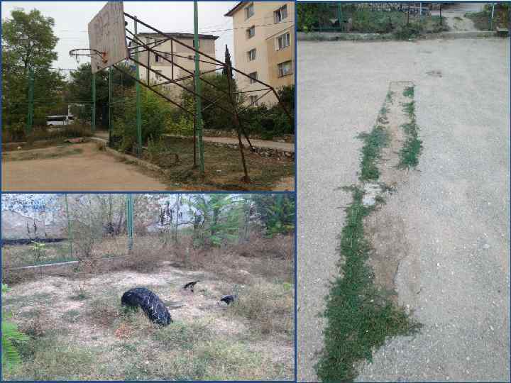 Состояние площадки на сентябрь 2015 1) 2) 3) 4) 5) 6) Площадка находится в аварийном состоянии: Покрытие площадки в ямах и трещинах, которые приводят к получению травм во время игры (разрывы и растяжения связок и мышц, травмы суставов) Разметка поля отсутствует, оборудование (стойки, щиты, кольца) не соответствуют игровым стандартам Ограждение площадки частично нарушено, что приводит к отсутствию безопасности игроков и прохожих (мяч систематически вылетает на проезжую часть, прохожие сокращают путь через территорию площадки) На территории площадки систематически накапливается мусор, а так же битое стекло и иные посторонние предметы на поверхности поля На площадке отсутствует искусственное освещение, что ограничивает время игры в весенний и осенний период Общая запущенность окружающей территории.