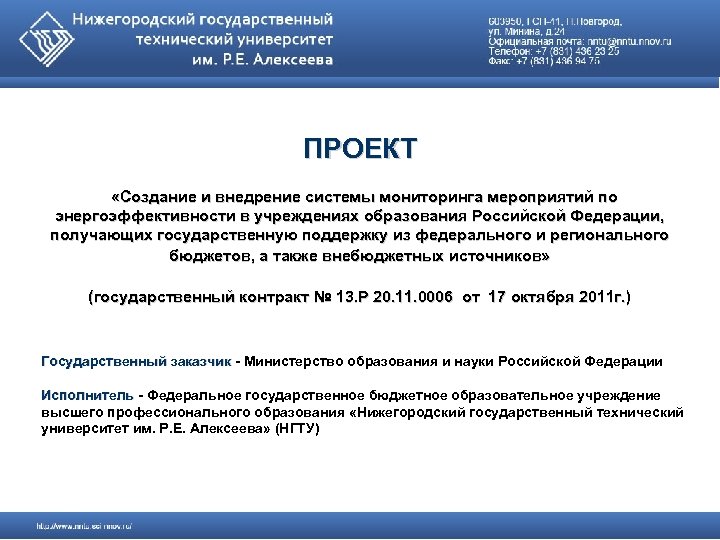 ПРОЕКТ «Создание и внедрение системы мониторинга мероприятий по энергоэффективности в учреждениях образования Российской Федерации, получающих государственную поддержку из федерального и регионального бюджетов, а также внебюджетных источников» (государственный контракт № 13. Р 20. 11. 0006 от 17 октября 2011 г. ) Государственный заказчик - Министерство образования и науки Российской Федерации Государственный заказчик Исполнитель - Федеральное государственное бюджетное образовательное учреждение Исполнитель высшего профессионального образования «Нижегородский государственный технический университет им. Р. Е. Алексеева» (НГТУ)