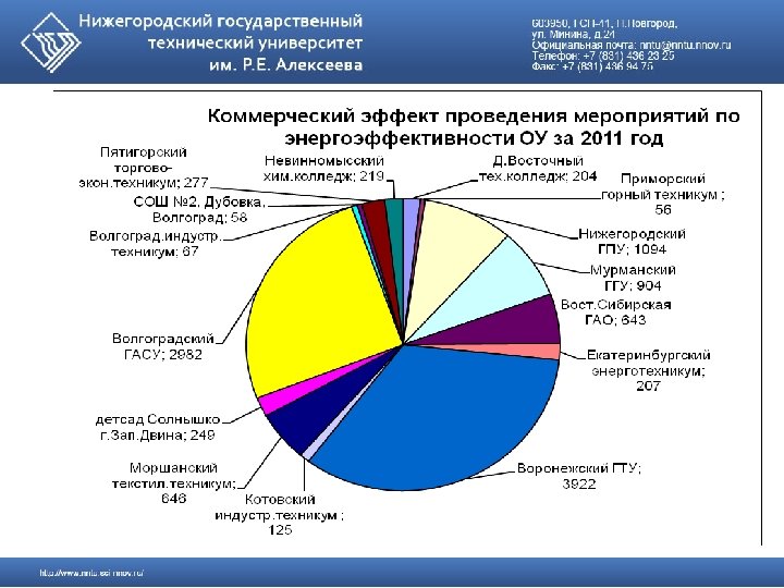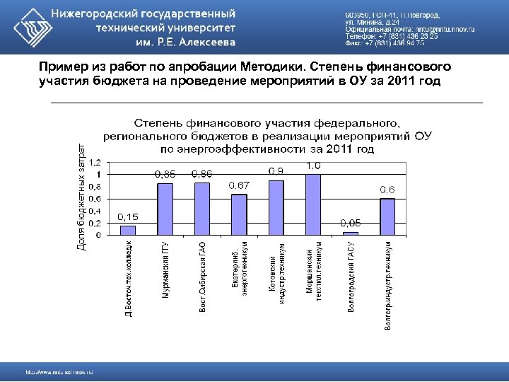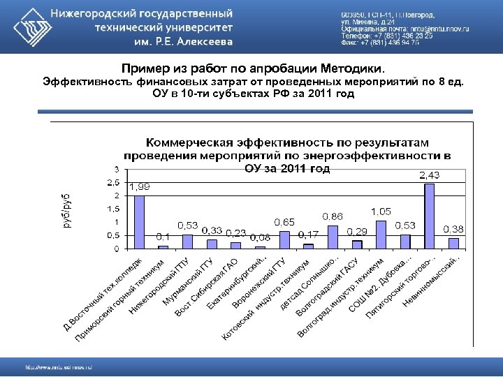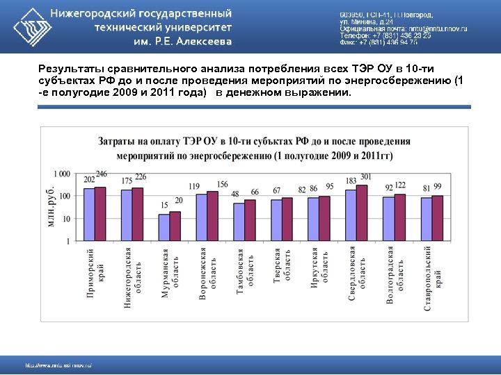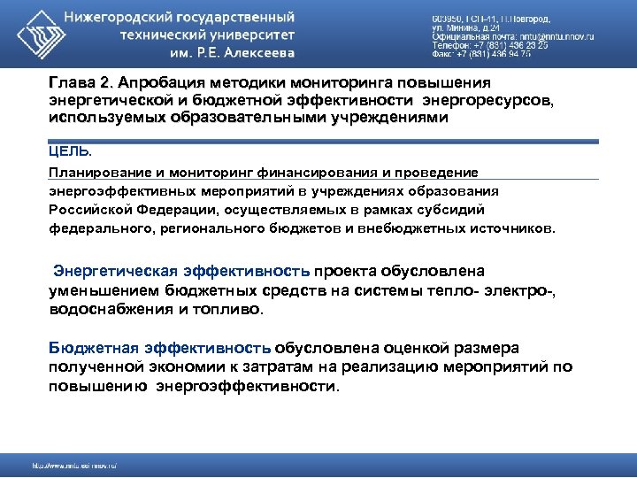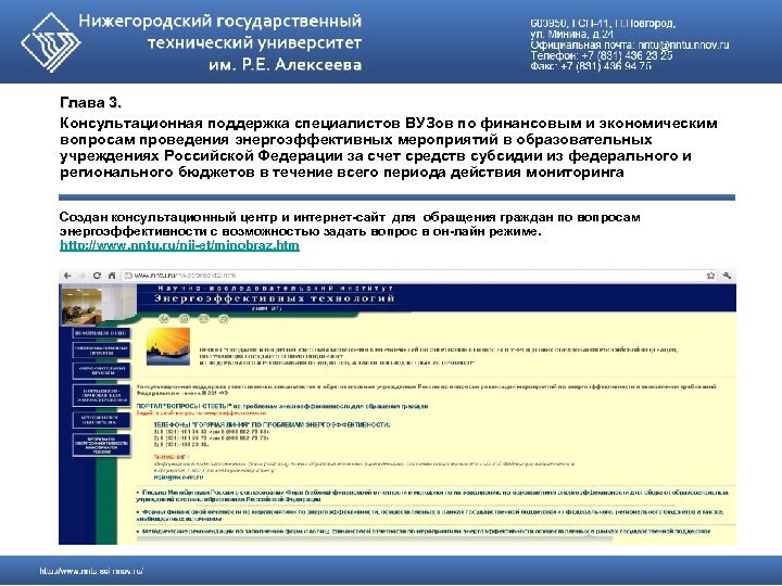 Глава 3. Консультационная поддержка специалистов ВУЗов по финансовым и экономическим вопросам проведения энергоэффективных мероприятий в образовательных учреждениях Российской Федерации за счет средств субсидии из федерального и регионального бюджетов в течение всего периода действия мониторинга Создан консультационный центр и интернет-сайт для обращения граждан по вопросам энергоэффективности с возможностью задать вопрос в он-лайн режиме. http: //www. nntu. ru/nii-et/minobraz. htm