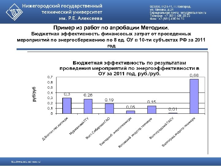 Пример из работ по апробации Методики. Бюджетная эффективность финансовых затрат от проведенных мероприятий по энергосбережению по 8 ед. ОУ в 10 -ти субъектах РФ за 2011 год