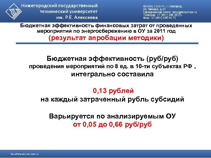 Бюджетная эффективность финансовых затрат от проведенных мероприятий по энергосбережению в ОУ за 2011 год (результат апробации методики) Бюджетная эффективность (руб/руб) проведения мероприятий по 8 ед. в 10 -ти субъектах РФ , интегрально составила 0, 13 рублей на каждый затраченный рубль субсидий Варьируется по анализируемым ОУ от 0, 05 до 0, 66 руб/руб