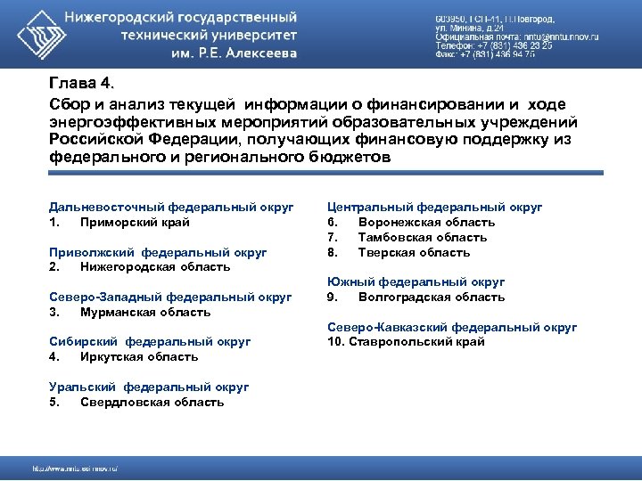 Глава 4. Сбор и анализ текущей информации о финансировании и ходе энергоэффективных мероприятий образовательных учреждений Российской Федерации, получающих финансовую поддержку из федерального и регионального бюджетов Дальневосточный федеральный округ 1. Приморский край Приволжский федеральный округ 2. Нижегородская область Северо-Западный федеральный округ 3. Мурманская область Сибирский федеральный округ 4. Иркутская область Уральский федеральный округ 5. Свердловская область Центральный федеральный округ 6. Воронежская область 7. Тамбовская область 8. Тверская область Южный федеральный округ 9. Волгоградская область Северо-Кавказский федеральный округ 10. Ставропольский край