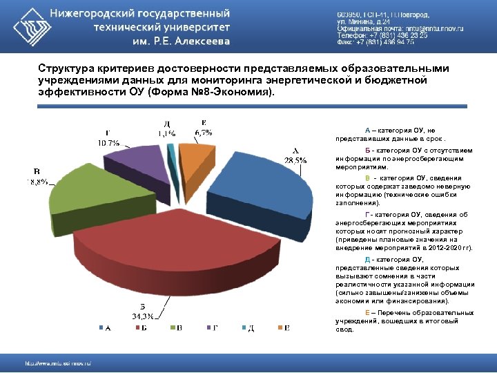 Структура критериев достоверности представляемых образовательными учреждениями данных для мониторинга энергетической и бюджетной эффективности ОУ (Форма № 8 -Экономия). А – категория ОУ, не представивших данные в срок. Б - категория ОУ с отсутствием информации по энергосберегающим мероприятиям. В - категория ОУ, сведения которых содержат заведомо неверную информацию (технические ошибки заполнения). Г - категория ОУ, сведения об энергосберегающих мероприятиях которых носят прогнозный характер (приведены плановые значения на внедрение мероприятий в 2012 -2020 гг). Д - категория ОУ, представленные сведения которых вызывают сомнения в части реалистичности указанной информации (сильно завышены/занижены объемы экономии или финансирования). Е – Перечень образовательных учреждений, вошедших в итоговый свод.