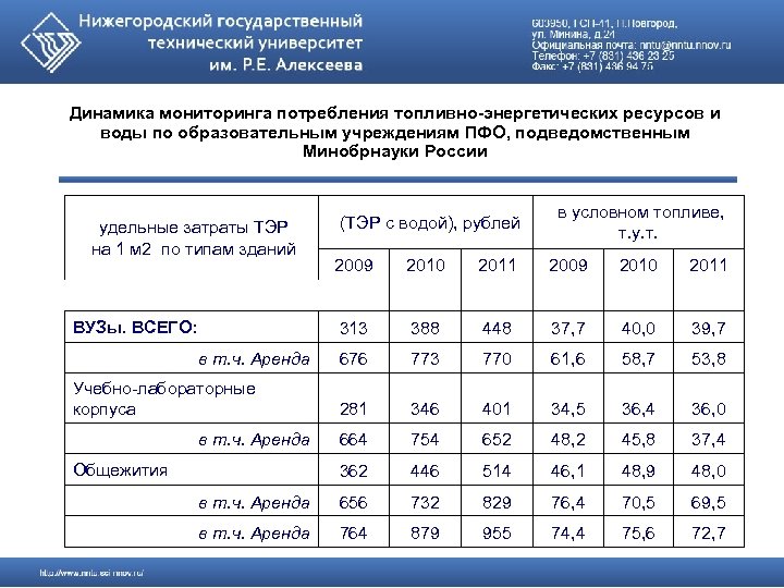 Динамика мониторинга потребления топливно-энергетических ресурсов и воды по образовательным учреждениям ПФО, подведомственным Минобрнауки России удельные затраты ТЭР на 1 м 2 по типам зданий (ТЭР с водой), рублей в условном топливе, т. у. т. 2009 2010 2011 313 388 448 37, 7 40, 0 39, 7 676 773 770 61, 6 58, 7 53, 8 281 346 401 34, 5 36, 4 36, 0 664 754 652 48, 2 45, 8 37, 4 362 446 514 46, 1 48, 9 48, 0 в т. ч. Аренда 656 732 829 76, 4 70, 5 69, 5 в т. ч. Аренда 764 879 955 74, 4 75, 6 72, 7 ВУЗы. ВСЕГО: в т. ч. Аренда Учебно-лабораторные корпуса в т. ч. Аренда Общежития