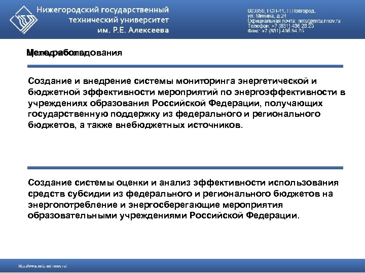 Метод исследования Цель работы Создание и внедрение системы мониторинга энергетической и бюджетной эффективности мероприятий по энергоэффективности в учреждениях образования Российской Федерации, получающих государственную поддержку из федерального и регионального бюджетов, а также внебюджетных источников. Создание системы оценки и анализ эффективности использования средств субсидии из федерального и регионального бюджетов на энергопотребление и энергосберегающие мероприятия образовательными учреждениями Российской Федерации.