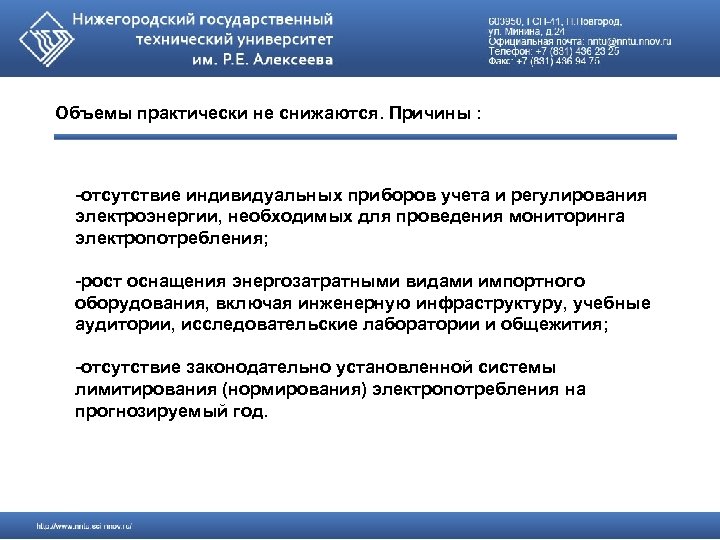 Объемы практически не снижаются. Причины : -отсутствие индивидуальных приборов учета и регулирования электроэнергии, необходимых для проведения мониторинга электропотребления; -рост оснащения энергозатратными видами импортного оборудования, включая инженерную инфраструктуру, учебные аудитории, исследовательские лаборатории и общежития; -отсутствие законодательно установленной системы лимитирования (нормирования) электропотребления на прогнозируемый год.