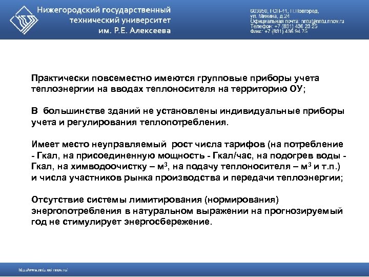 Практически повсеместно имеются групповые приборы учета теплоэнергии на вводах теплоносителя на территорию ОУ; В большинстве зданий не установлены индивидуальные приборы учета и регулирования теплопотребления. Имеет место неуправляемый рост числа тарифов (на потребление - Гкал, на присоединенную мощность - Гкал/час, на подогрев воды - Гкал, на химводоочистку – м 3, на подачу теплоносителя – м 3 и т. п. ) и числа участников рынка производства и передачи теплоэнергии; Отсутствие системы лимитирования (нормирования) энергопотребления в натуральном выражении на прогнозируемый год не стимулирует энергосбережение.