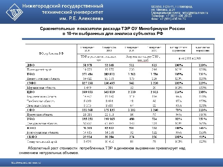 Сравнительные показатели расхода ТЭР ОУ Минобрнауки России в 10 -ти выбранных для анализа субъектах РФ Абсолютный рост стоимости потребленных ТЭР в денежном выражении превалирует над снижением натуральных объемов.