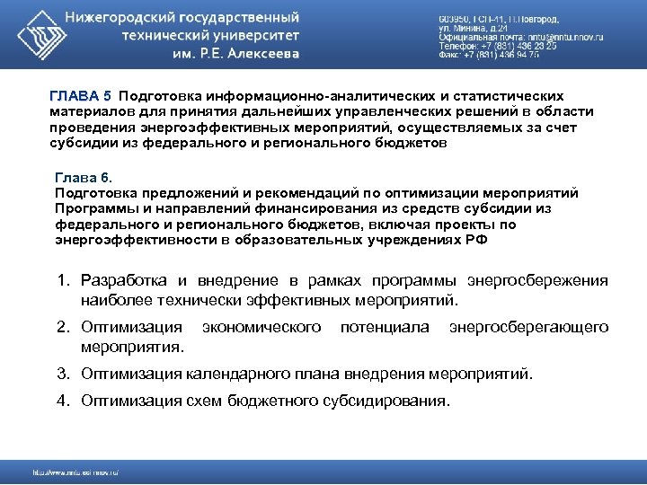 ГЛАВА 5 Подготовка информационно-аналитических и статистических ГЛАВА 5 материалов для принятия дальнейших управленческих решений в области проведения энергоэффективных мероприятий, осуществляемых за счет субсидии из федерального и регионального бюджетов Глава 6. Подготовка предложений и рекомендаций по оптимизации мероприятий Программы и направлений финансирования из средств субсидии из федерального и регионального бюджетов, включая проекты по энергоэффективности в образовательных учреждениях РФ 1. Разработка и внедрение в рамках программы энергосбережения наиболее технически эффективных мероприятий. 2. Оптимизация мероприятия. экономического потенциала энергосберегающего 3. Оптимизация календарного плана внедрения мероприятий. 4. Оптимизация схем бюджетного субсидирования.
