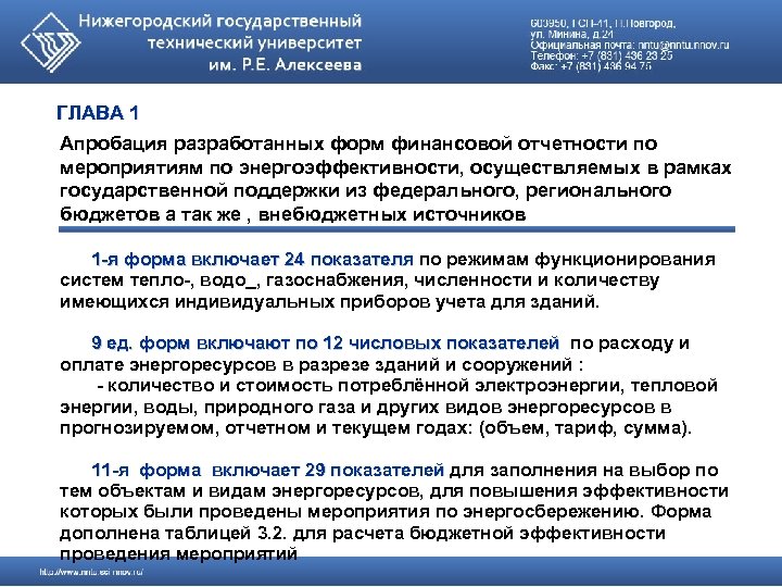 ГЛАВА 1 Апробация разработанных форм финансовой отчетности по мероприятиям по энергоэффективности, осуществляемых в рамках государственной поддержки из федерального, регионального бюджетов а так же , внебюджетных источников 1 -я форма включает 24 показателя по режимам функционирования 1 -я форма включает 24 показателя систем тепло-, водо_, газоснабжения, численности и количеству имеющихся индивидуальных приборов учета для зданий. 9 ед. форм включают по 12 числовых показателей по расходу и 9 ед. форм включают по 12 числовых показателей оплате энергоресурсов в разрезе зданий и сооружений : - количество и стоимость потреблённой электроэнергии, тепловой энергии, воды, природного газа и других видов энергоресурсов в прогнозируемом, отчетном и текущем годах: (объем, тариф, сумма). 11 -я форма включает 29 показателей для заполнения на выбор по 11 -я форма включает 29 показателей тем объектам и видам энергоресурсов, для повышения эффективности которых были проведены мероприятия по энергосбережению. Форма дополнена таблицей 3. 2. для расчета бюджетной эффективности проведения мероприятий