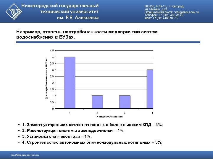 Например, степень востребованности мероприятий систем водоснабжения в ВУЗах. • • 1. Замена устаревших котлов на новые, с более высоким КПД – 4%; 2. Реконструкция системы химводоочистки – 1%; 3. Установка счетчиков газа – 1%. 4. Строительство автономных блочно-модульных котельных – 3%;