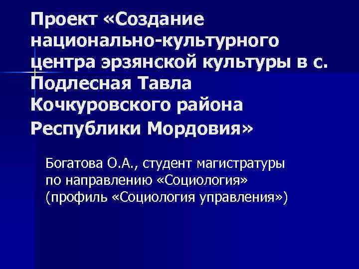 Проект «Создание национально-культурного центра эрзянской культуры в с. Подлесная Тавла Кочкуровского района Республики Мордовия» Богатова О. А. , студент магистратуры по направлению «Социология» (профиль «Социология управления» )