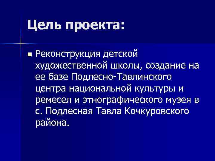 Цель проекта: n Реконструкция детской художественной школы, создание на ее базе Подлесно-Тавлинского центра национальной культуры и ремесел и этнографического музея в с. Подлесная Тавла Кочкуровского района.
