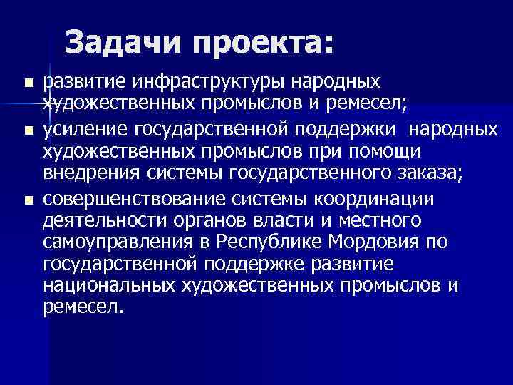 Задачи проекта: n развитие инфраструктуры народных художественных промыслов и ремесел; n усиление государственной поддержки народных художественных промыслов при помощи внедрения системы государственного заказа; n совершенствование системы координации деятельности органов власти и местного самоуправления в Республике Мордовия по государственной поддержке развитие национальных художественных промыслов и ремесел.