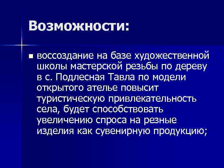 Возможности: n воссоздание на базе художественной школы мастерской резьбы по дереву в с. Подлесная Тавла по модели открытого ателье повысит туристическую привлекательность села, будет способствовать увеличению спроса на резные изделия как сувенирную продукцию;