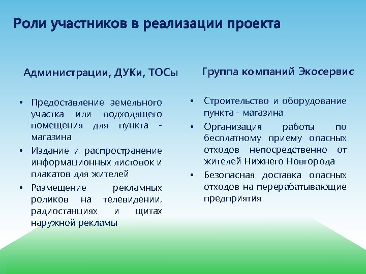 Роли участников в реализации проекта Группа компаний Экосервис Администрации, ДУКи, ТОСы • Предоставление земельного участка или подходящего помещения для пункта магазина • Издание и распространение информационных листовок и плакатов для жителей • Размещение рекламных роликов на телевидении, радиостанциях и щитах наружной рекламы • • • Строительство и оборудование пункта - магазина Организация работы по бесплатному приему опасных отходов непосредственно от жителей Нижнего Новгорода Безопасная доставка опасных отходов на перерабатывающие предприятия