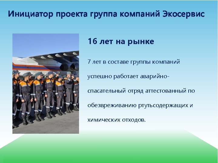 Инициатор проекта группа компаний Экосервис 16 лет на рынке 7 лет в составе группы компаний успешно работает аварийноспасательный отряд аттестованный по обезвреживанию ртутьсодержащих и химических отходов.