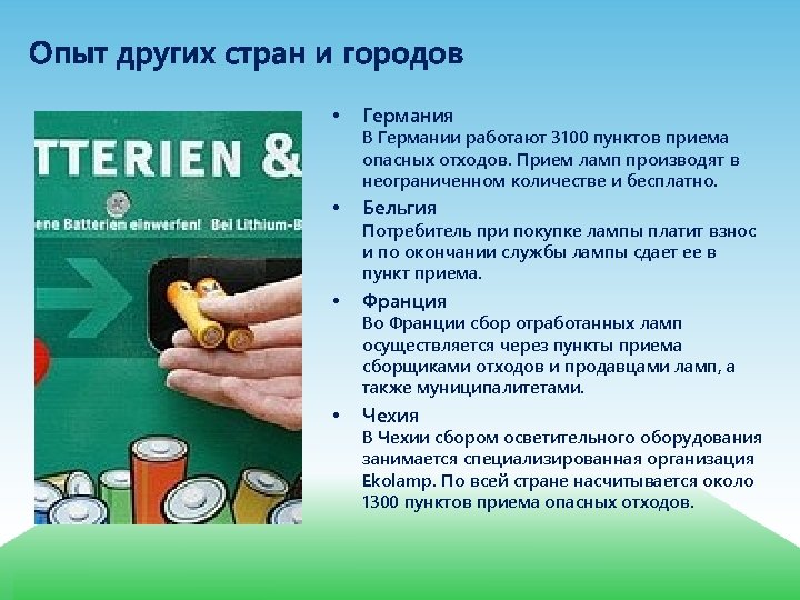 Опыт других стран и городов • Германия • Бельгия • Франция • Чехия В Германии работают 3100 пунктов приема опасных отходов. Прием ламп производят в неограниченном количестве и бесплатно. Потребитель при покупке лампы платит взнос и по окончании службы лампы сдает ее в пункт приема. Во Франции сбор отработанных ламп осуществляется через пункты приема сборщиками отходов и продавцами ламп, а также муниципалитетами. В Чехии сбором осветительного оборудования занимается специализированная организация Ekolamp. По всей стране насчитывается около 1300 пунктов приема опасных отходов.