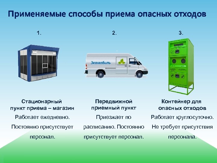 Применяемые способы приема опасных отходов 1. 2. 3. Стационарный пункт приема – магазин Передвижной приемный пункт Контейнер для опасных отходов Работает ежедневно. Приезжает по Работает круглосуточно. Постоянно присутствует расписанию. Постоянно Не требует присутствия персонал. присутствует персонала.