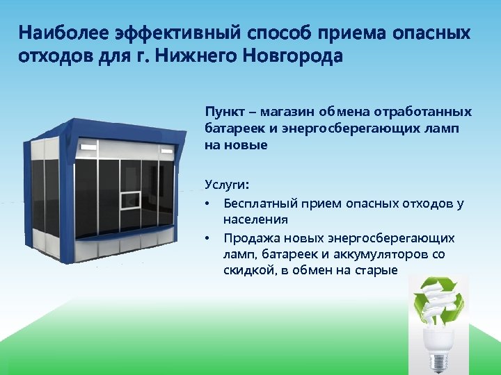 Наиболее эффективный способ приема опасных отходов для г. Нижнего Новгорода Пункт – магазин обмена отработанных батареек и энергосберегающих ламп на новые Услуги: • Бесплатный прием опасных отходов у населения • Продажа новых энергосберегающих ламп, батареек и аккумуляторов со скидкой, в обмен на старые
