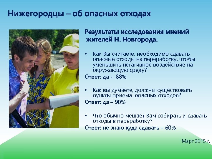 Нижегородцы – об опасных отходах Результаты исследования мнений жителей Н. Новгорода. Как Вы считаете, необходимо сдавать опасные отходы на переработку, чтобы уменьшить негативное воздействие на окружающую среду? Ответ: да - 88% • Как вы думаете, должны существовать пункты приема опасных отходов? Ответ: да – 90% • Что обычно мешает Вам собирать и сдавать отходы в переработку? Ответ: не знаю куда сдавать – 60% • Март 2015 г.
