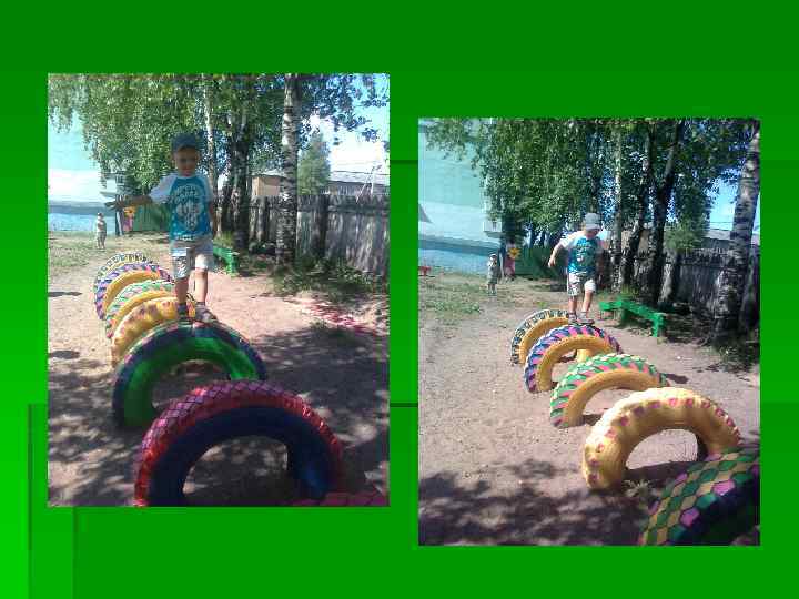 Бег: § « Змейкой» между колёсами § Бег по цветным кружкам § Бег по беговым дорожкам § Бег врассыпную по площадке § Челночный бег Цель: Упражнять детей в различных видах бега, развивать пространственную ориентировку, выносливость, быстроту, умение реагировать на сигнал, менять направление и темп движения.