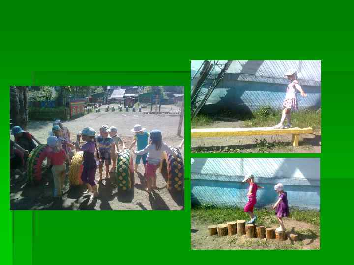 Ходьба: § § По бревну, пятка к носку. По доске (боком приставным шагом) По лесенке из пенёчков (вверх- вниз) « Змейкой» между разноцветными кружочками. § Цель: Упражнять детей в различных видах ходьбы: пятка к носку, приставным шагом, по уменьшенной площади опоры, с переходами вверх- вниз, между предметами. Развивать равновесие, ориентировку в пространстве.