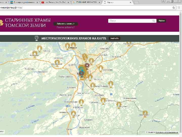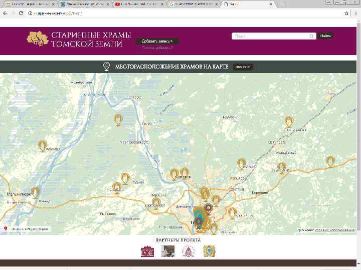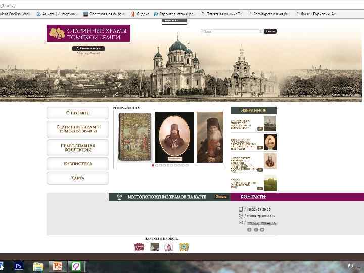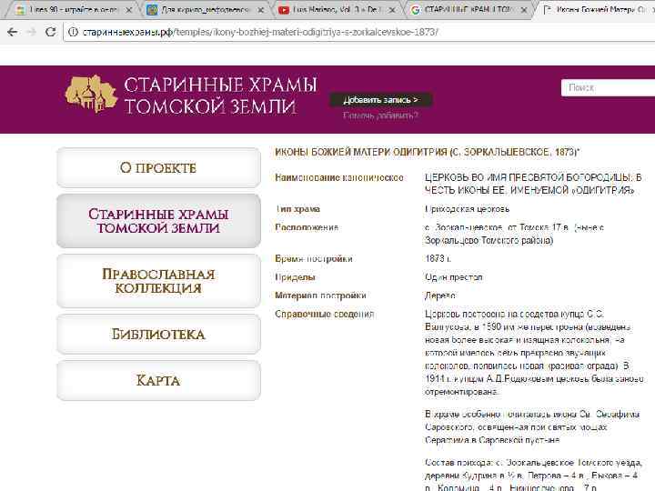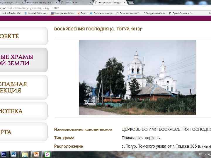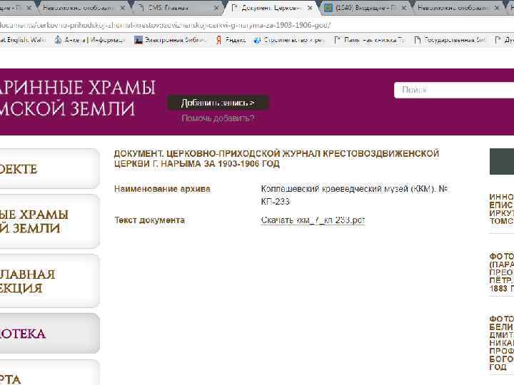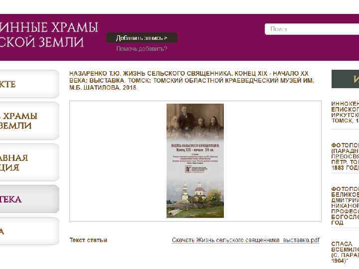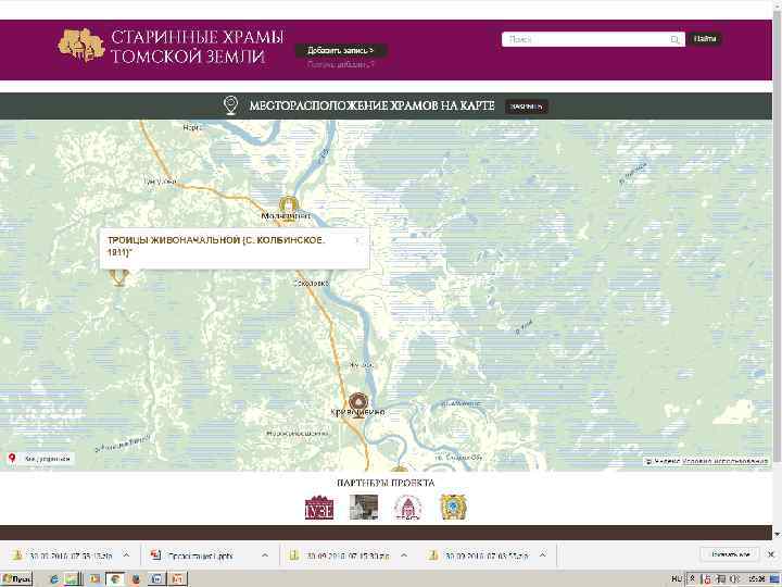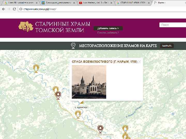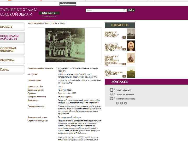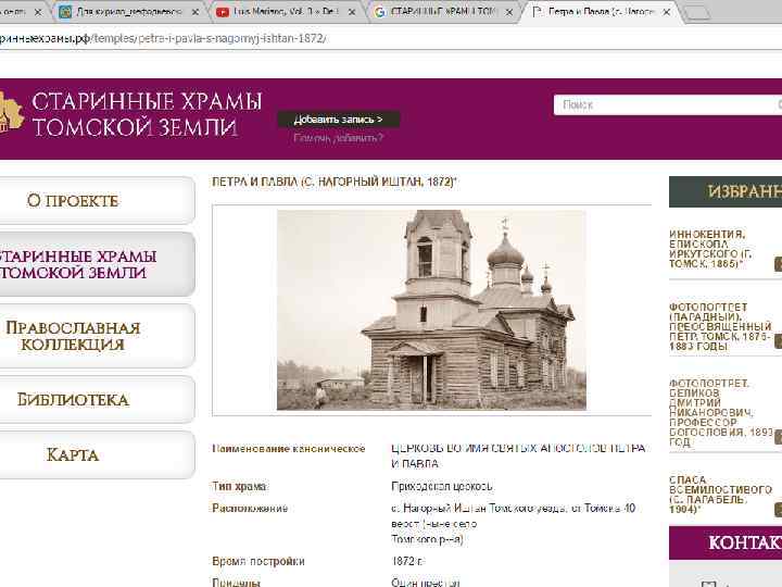Проект «Старинные храмы томской земли (передвижная выставка с виртуальным компонентом)» Проект направлен на популяризацию истории православия – одного из инструментов духовного воспитания, на передачу молодым поколениям устоявшихся во времени культурных ценностей, культурных национальных кодов. Целевая группа: массовая аудитория, более всего – детско-юношеская. Организация: Томский областной краеведческий музей им. М. Б. Шатилова Руководитель проекта: Андреева Елена Анатольевна; эл. почта: nurrikissam@list. ru; сайт: старинныехрамы. рф